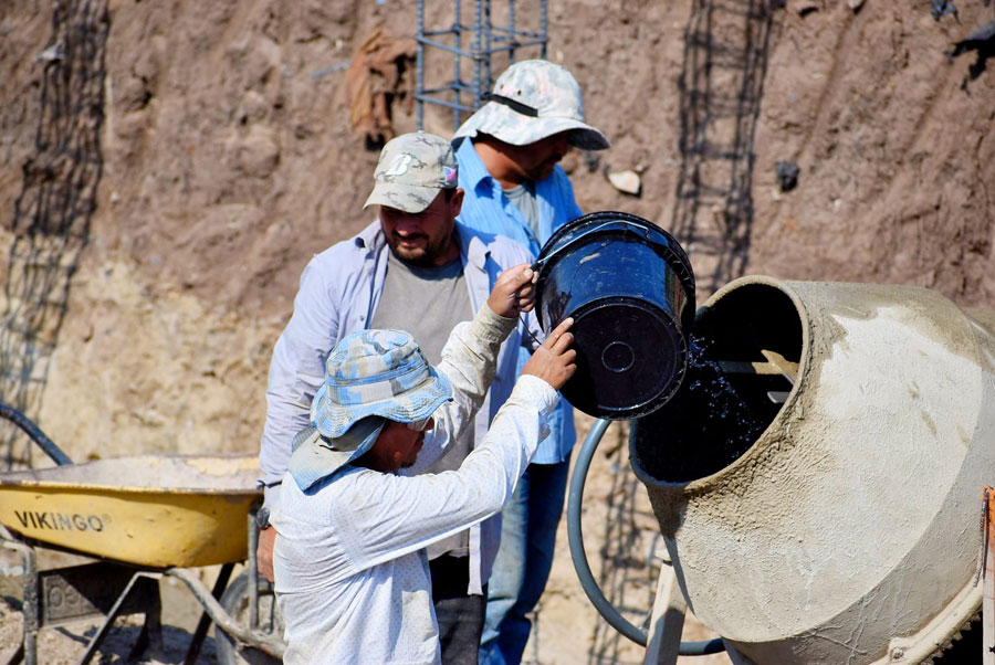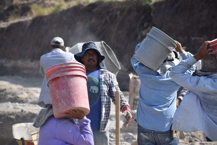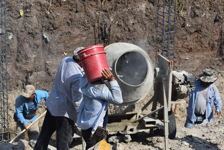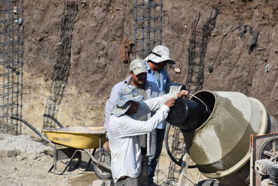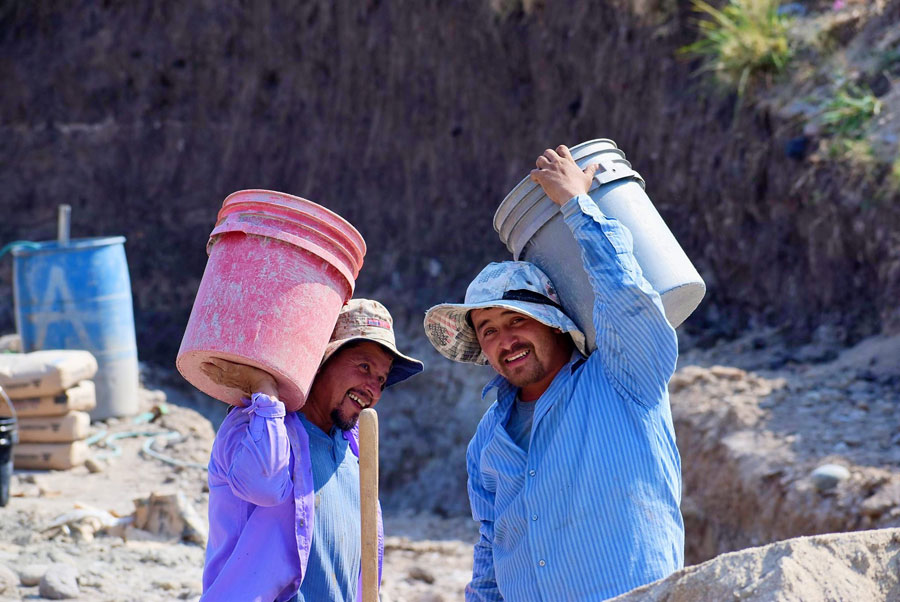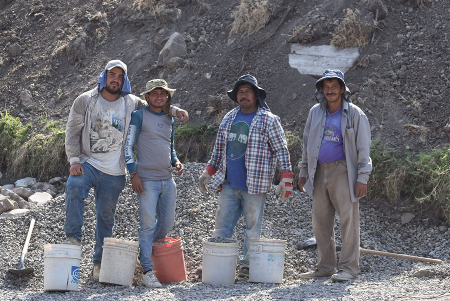 Albañiles y ayudantes trabajan en el quinel de conducción de agua