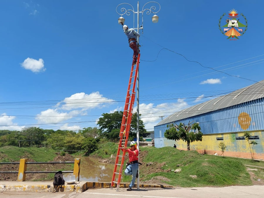 Empleados del área de electricidad realizan mantenimiento y reparación del alumbrado público en las áreas aledañas al Polideportivo y puente ubicado en Barrio Tecuan con el fin de mejorar el servicio de alumbrado público.