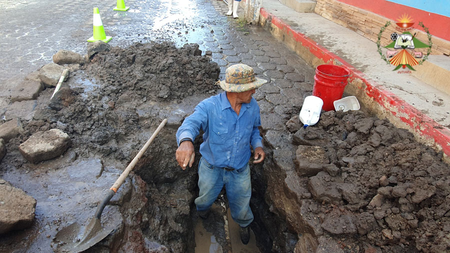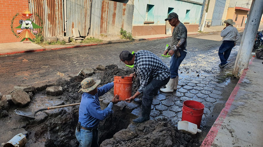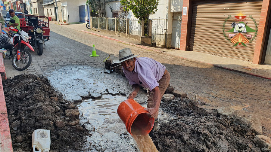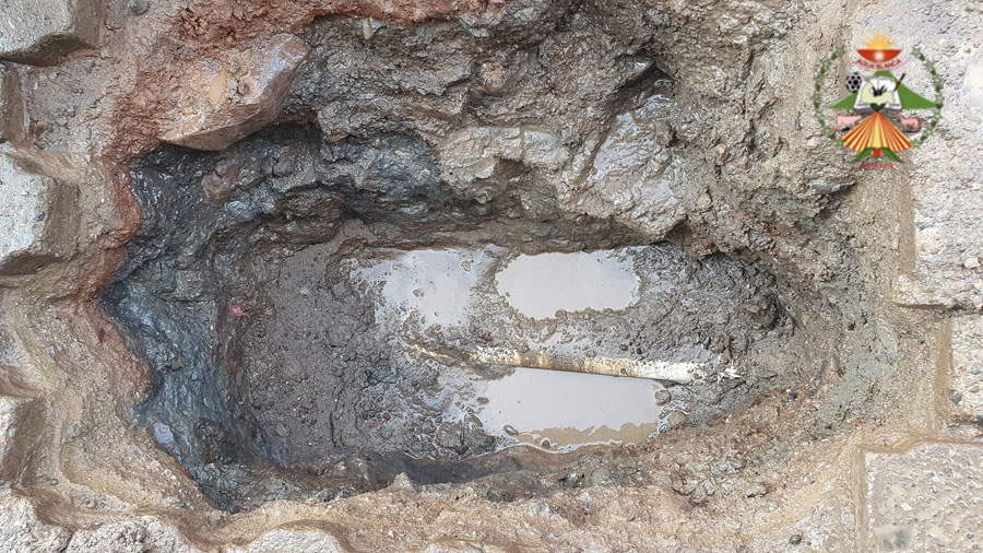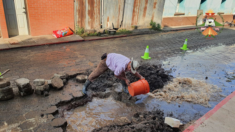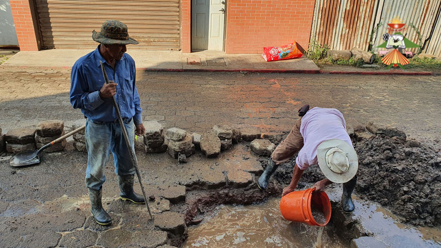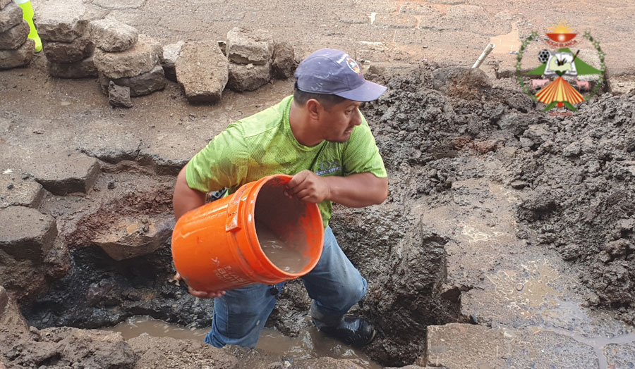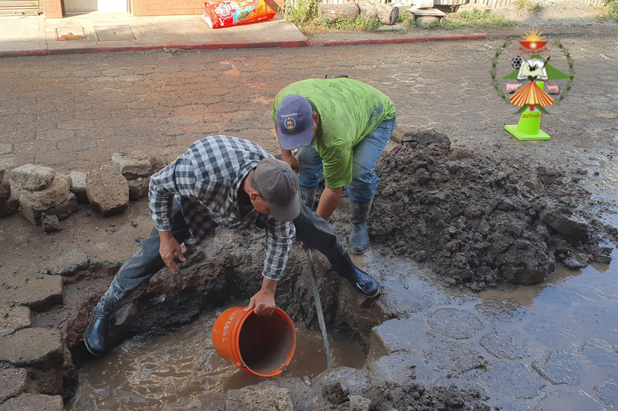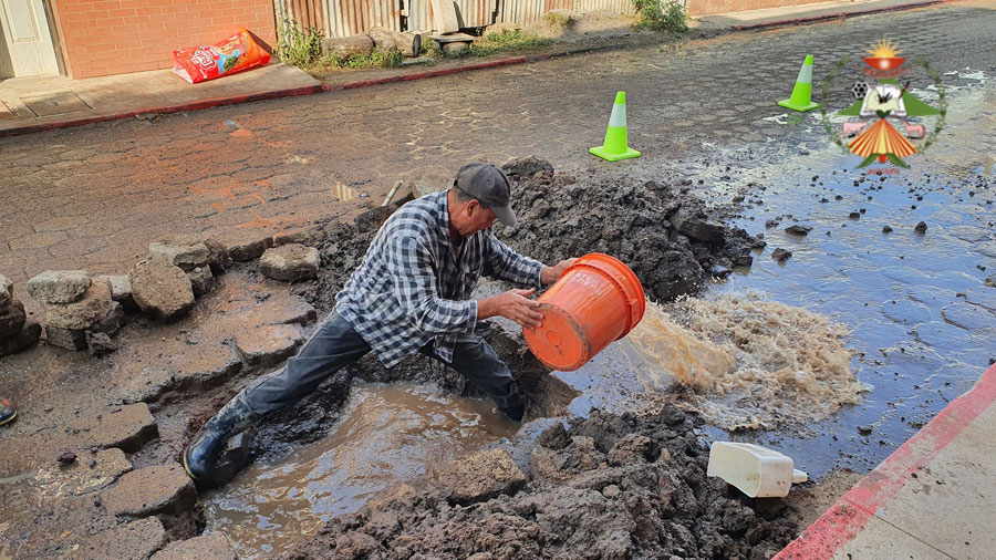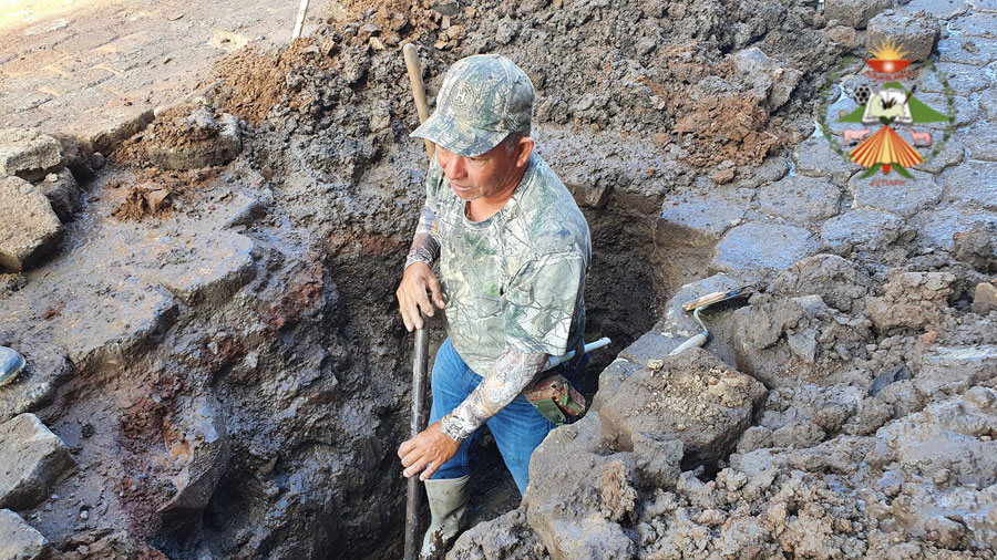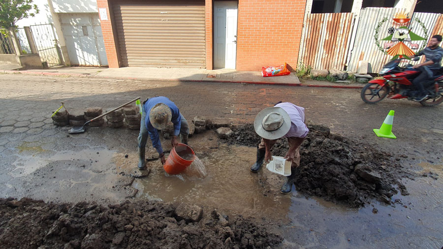 Trabajando en la segunda fuga de agua detectada en el nuevo pavimento de Barrio La Federal