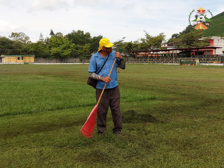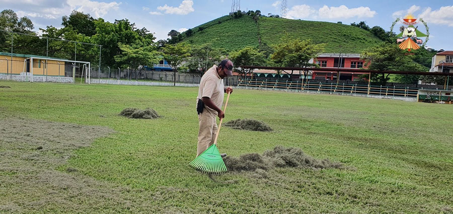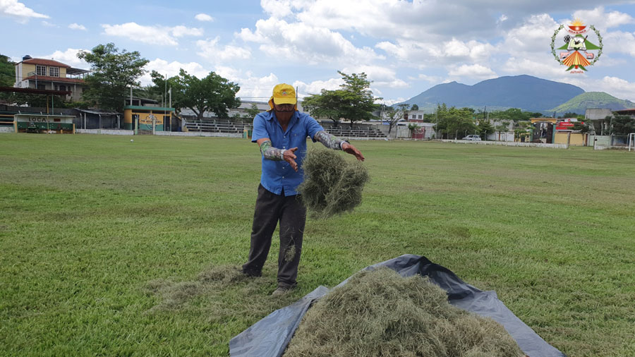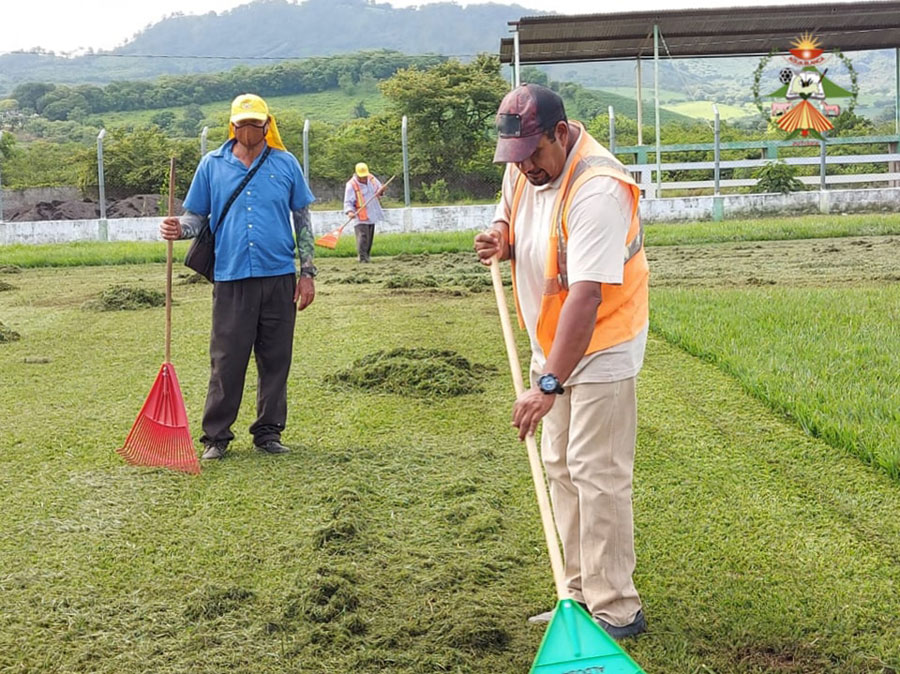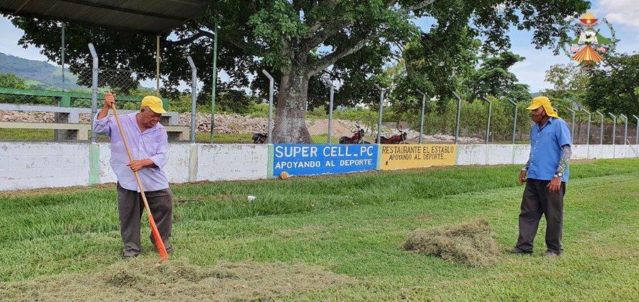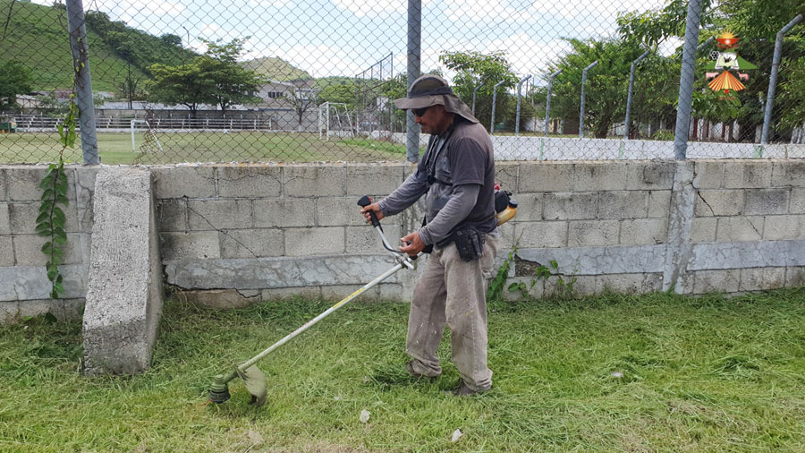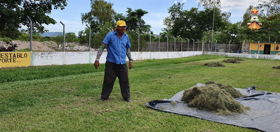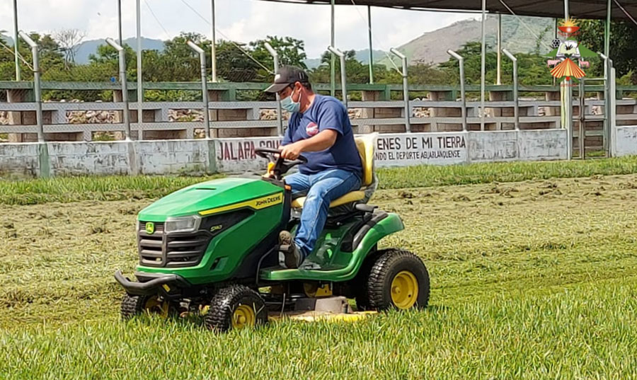Trabajos de corte de césped en el Estadio Roquelino Escobar